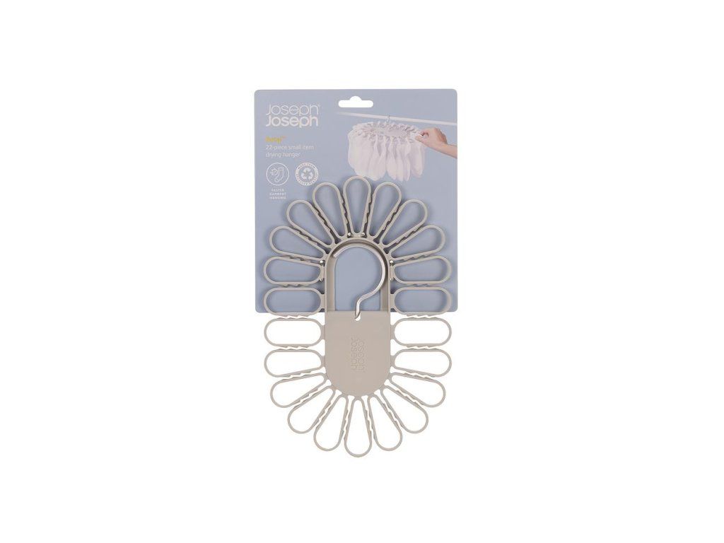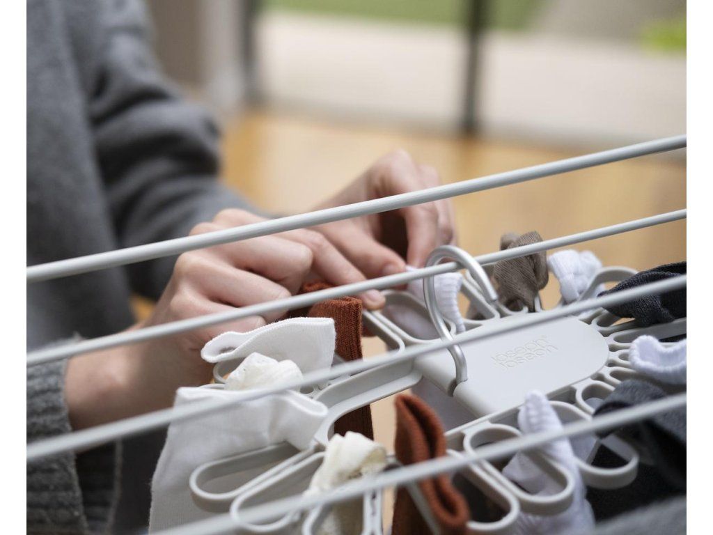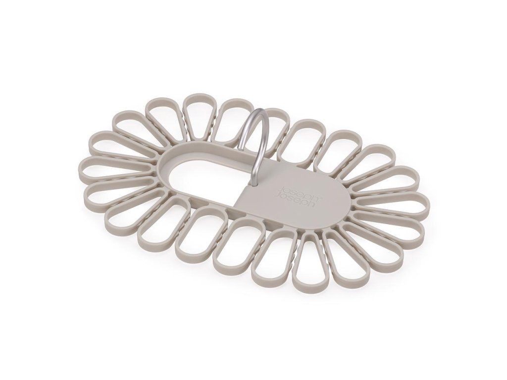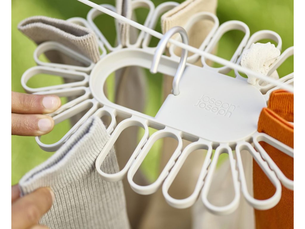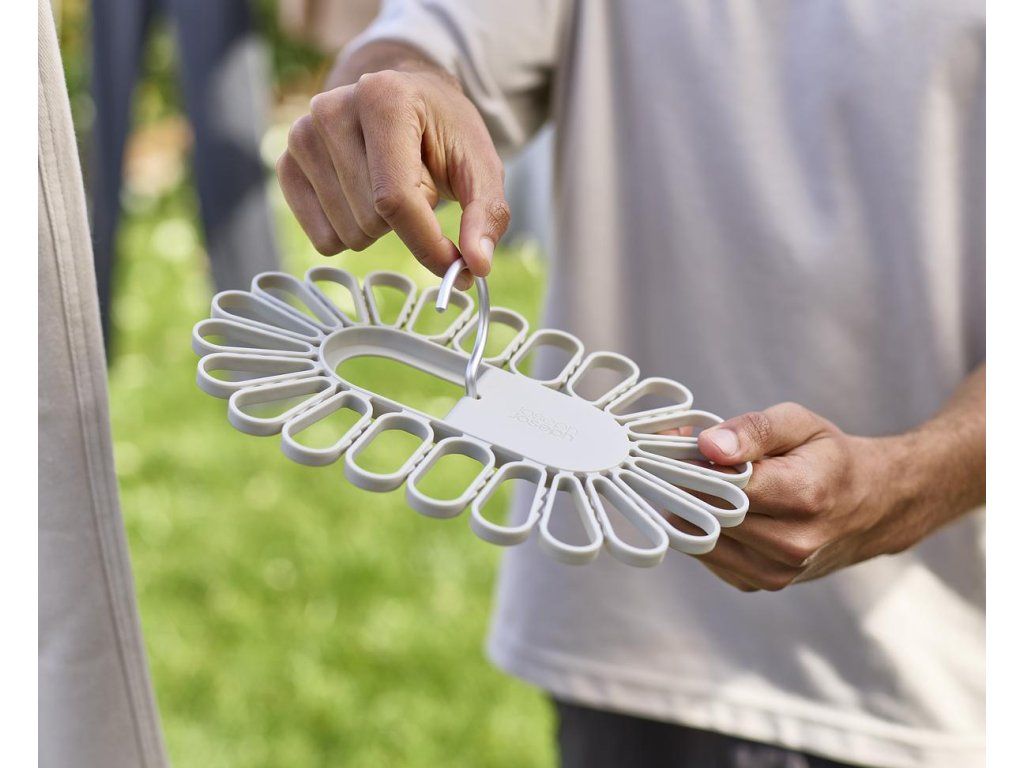 Nápaditý sušák JOSEPH JOSEPH Petal je ideální pro sušením menších kusů prádla. Ponožky nebo spodní prádlo jednoduše vkládáte mezi oválné svorky rozmístěné po obvodu sušáku. Model 55051 pojme až 22 kusů, model 55052 až 32 kusů prádla. Sušák má dva sklopné hliníkové háky pro bezpečné vnitřní nebo venkovní zavěšení. Složení háků naplocho umožňuje prostorově úsporného skladování. Barevné provedení Ecru (barva surového hedvábí resp. neběleného plátna).
