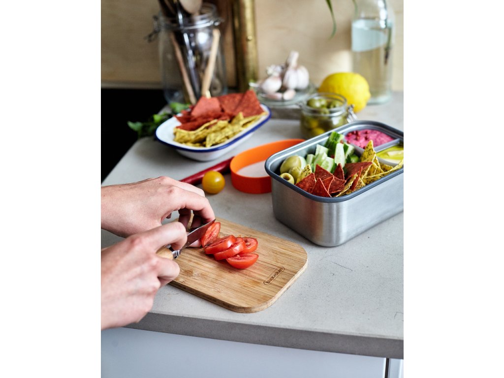 Cestovní svačinová nádoba má velkou nerezovou misku (nerezová ocel 304/18-8) o objemu 1,25 l, dělenou silikonovou vnitřní přihrádku, praktické antibakteriální bambusové víčko/prkénko použitelné ke krájení i servírování a silikonový stabilizační pásek pro pohodlné přenášení.