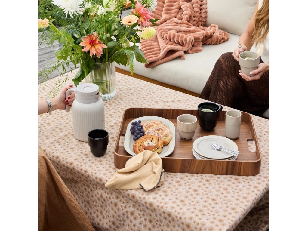 Termokonvice SAGAFORM Trine je vyrobena z nerezové oceli s dvojitou vakuovou izolací. Vnitřní povrch je potažen tenkou měděnou vrstvou. Vnější povrch je matný, práškově lakovaný. Termoska má víčko s tlačítkem umožňujícím servírování bez rozlití a šroubovací závit pro snadné otevření.