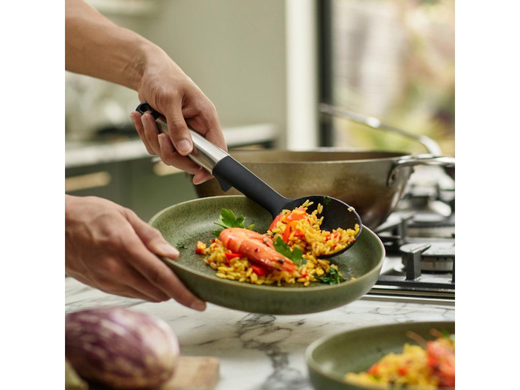 Vařečka s podpěrou omezující znečištění pracovní plochy. Nástroje Elevate Silicone/Steel mají vyvážená nerezová madla a silikonovou pracovní část. Jsou určeny k vaření do teplot 210˚C, kleště do teploty 270˚C. Silikonové nástroje jsou šetrné k nádobí s nepřilnavým povrchem. Nástroje lze mýt v myčce. Silikonové nástroje neponechávejte v průběhu vaření ve varných nádobách. Jako prevenci proti možnému zabarvení doporučujeme nepoužívat nástroje se silikonovou pracovní částí pro vaření se silnými zabarvovači (např. kurkuma). Velikost: 7,2 x 31 x 6,7 cm (VxŠxH).