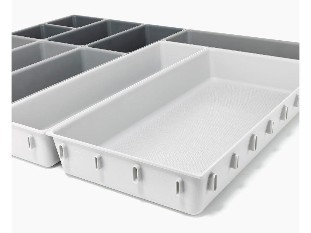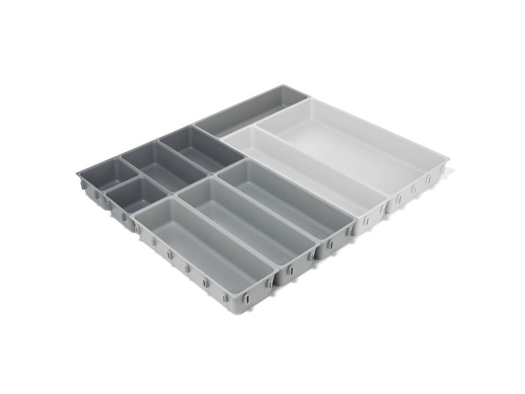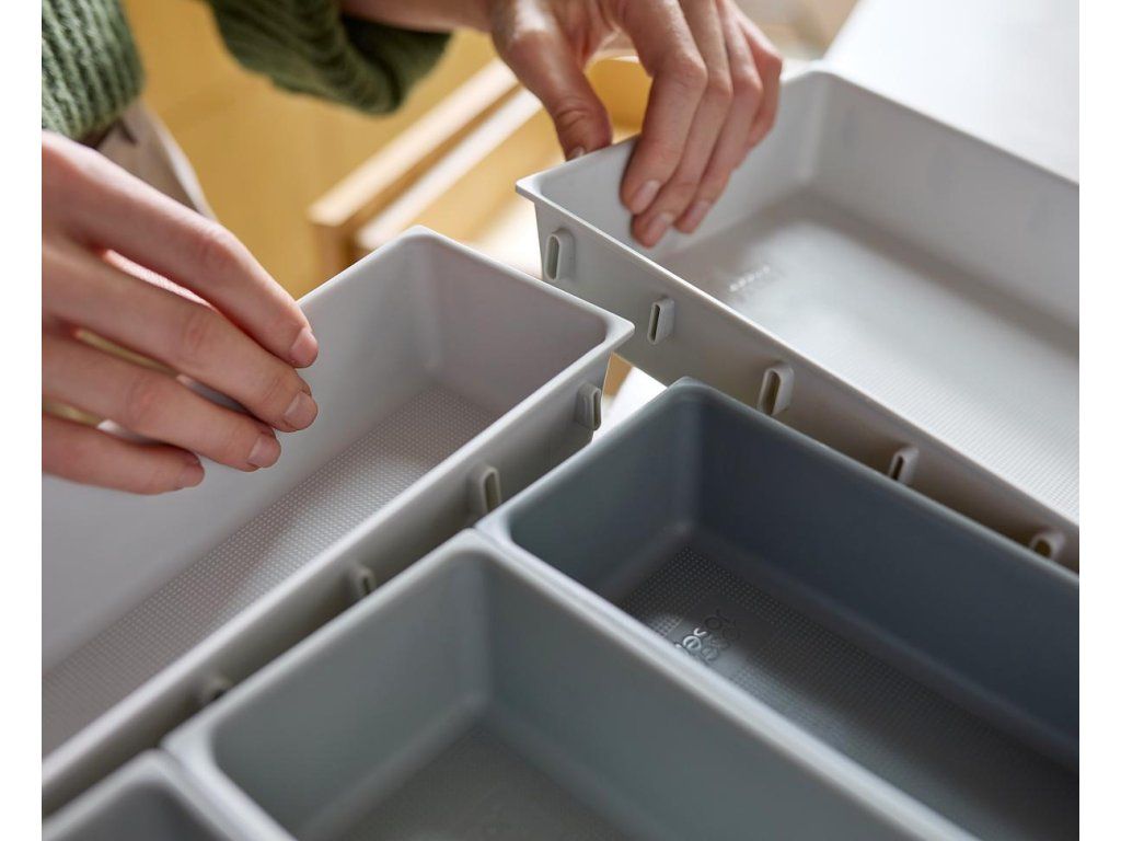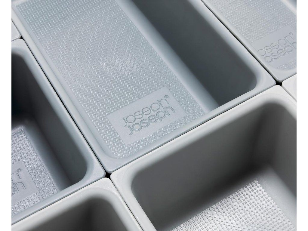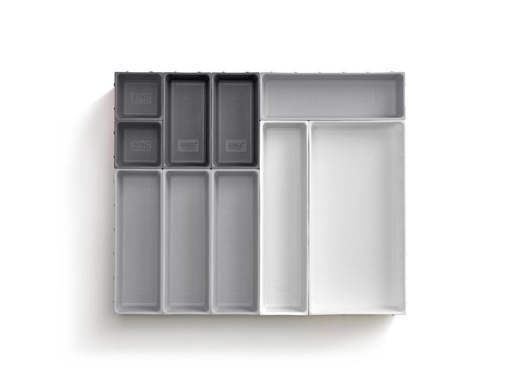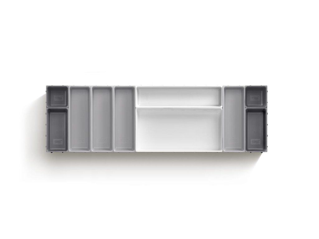 Variabilní zásuvkový organizér JOSEPH JOSEPH Blox 10 8500018 tvoří 10 nezávislých plastových misek různých velikostí, které můžete pomocí klipů umístěných na všech bocích misek libovolně spojovat tak, aby jste optimálně zaplnili prostor zásuvky. Blox využijete pro ukládání příborů, kuchyňských nástrojů, kancelářských potřeb, ale i nástrojů a doplńků pro řemeslníky. Součástí dodávky jsou samolepící protiskluzné nožky.