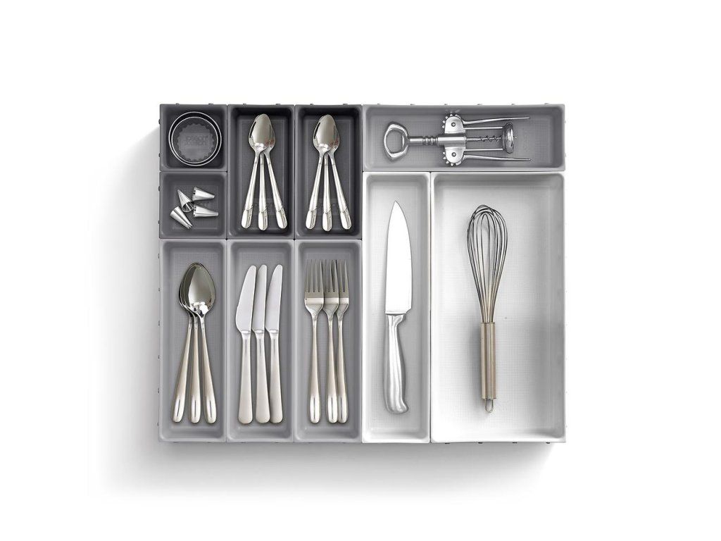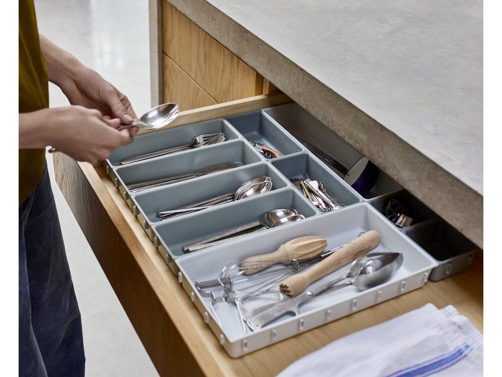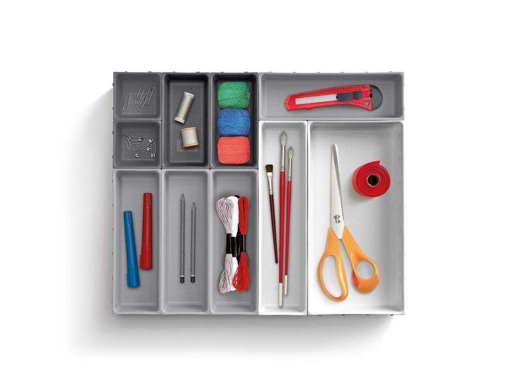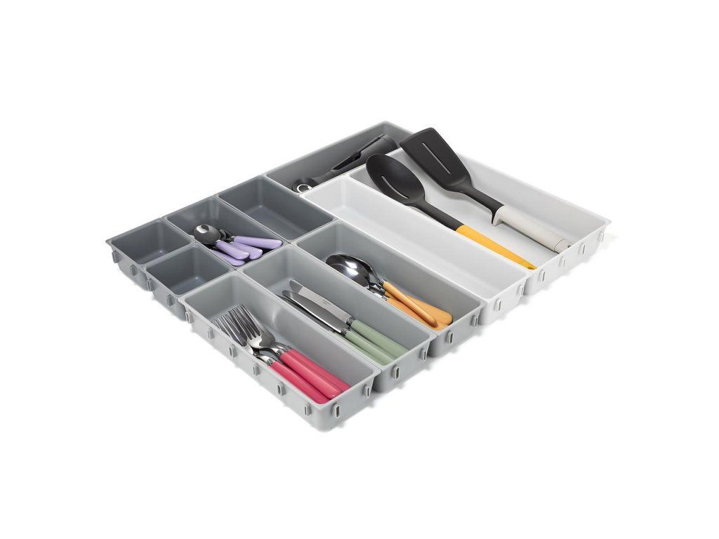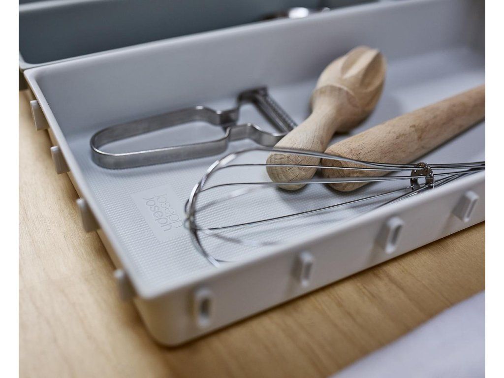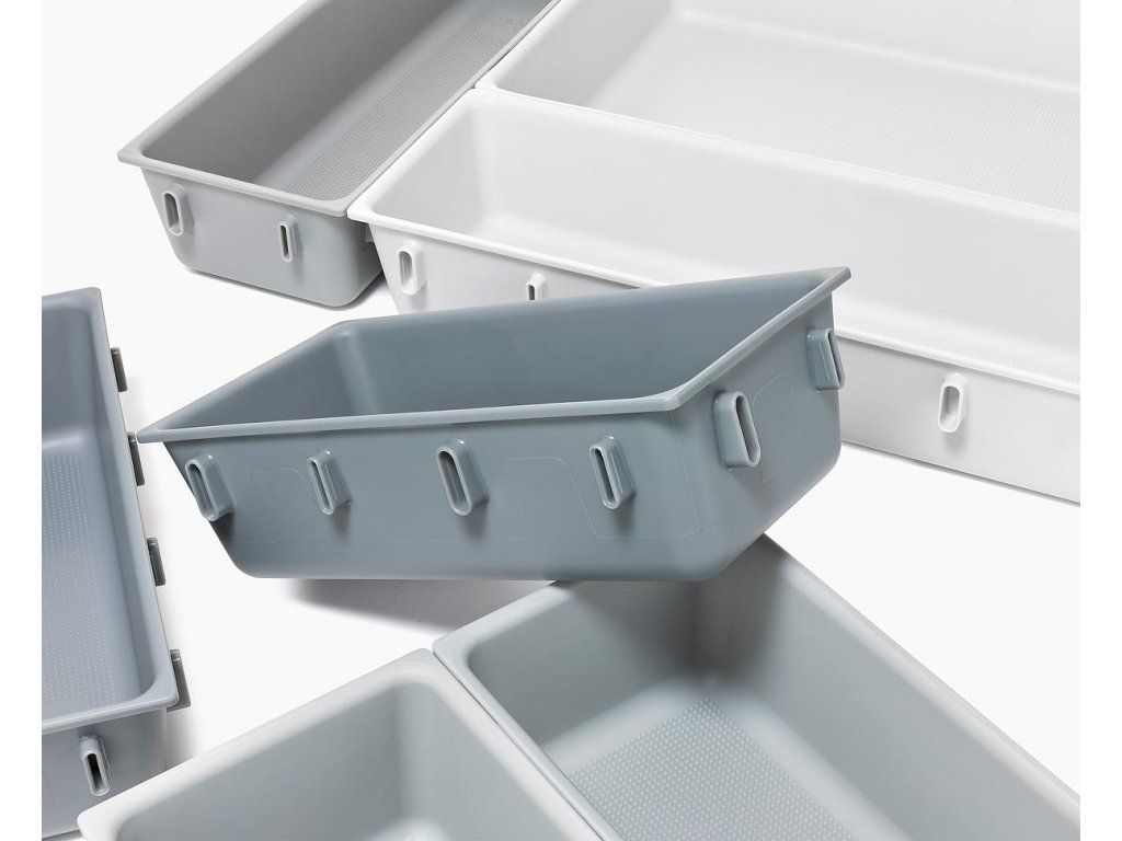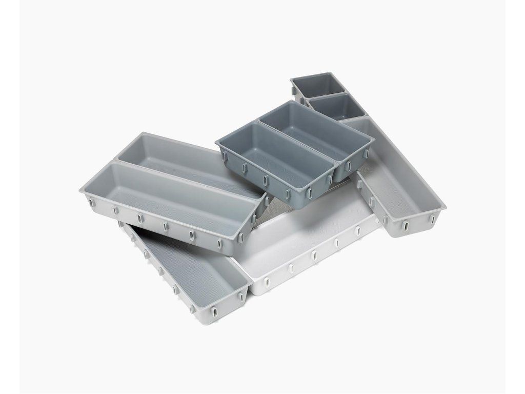 Variabilní zásuvkový organizér JOSEPH JOSEPH Blox 10 8500018 tvoří 10 nezávislých plastových misek různých velikostí, které můžete pomocí klipů umístěných na všech bocích misek libovolně spojovat tak, aby jste optimálně zaplnili prostor zásuvky. Blox využijete pro ukládání příborů, kuchyňských nástrojů, kancelářských potřeb, ale i nástrojů a doplńků pro řemeslníky. Součástí dodávky jsou samolepící protiskluzné nožky.