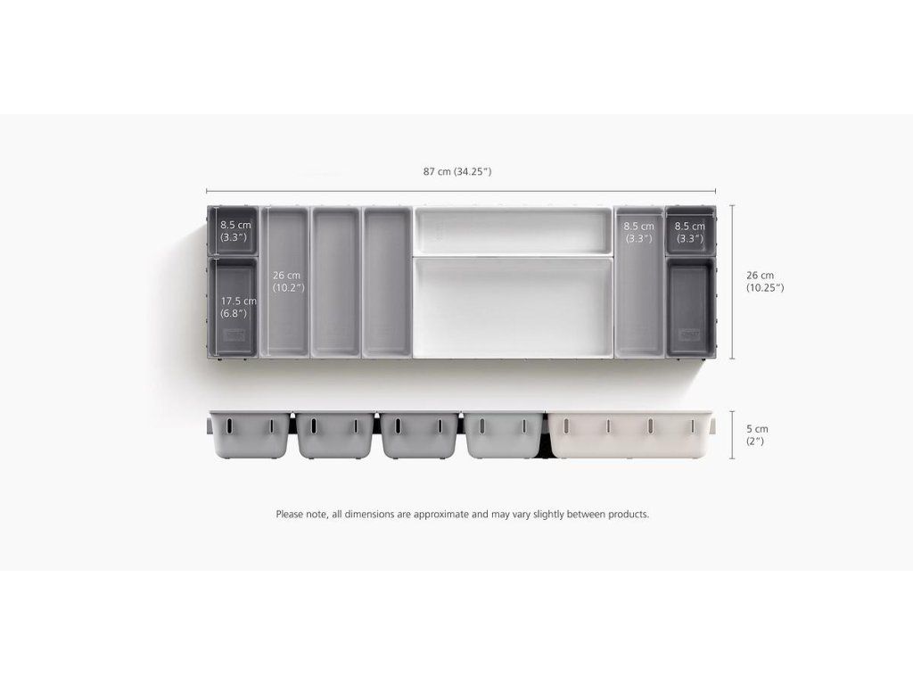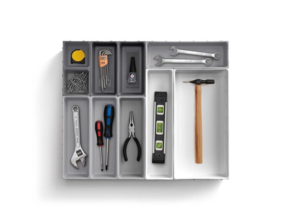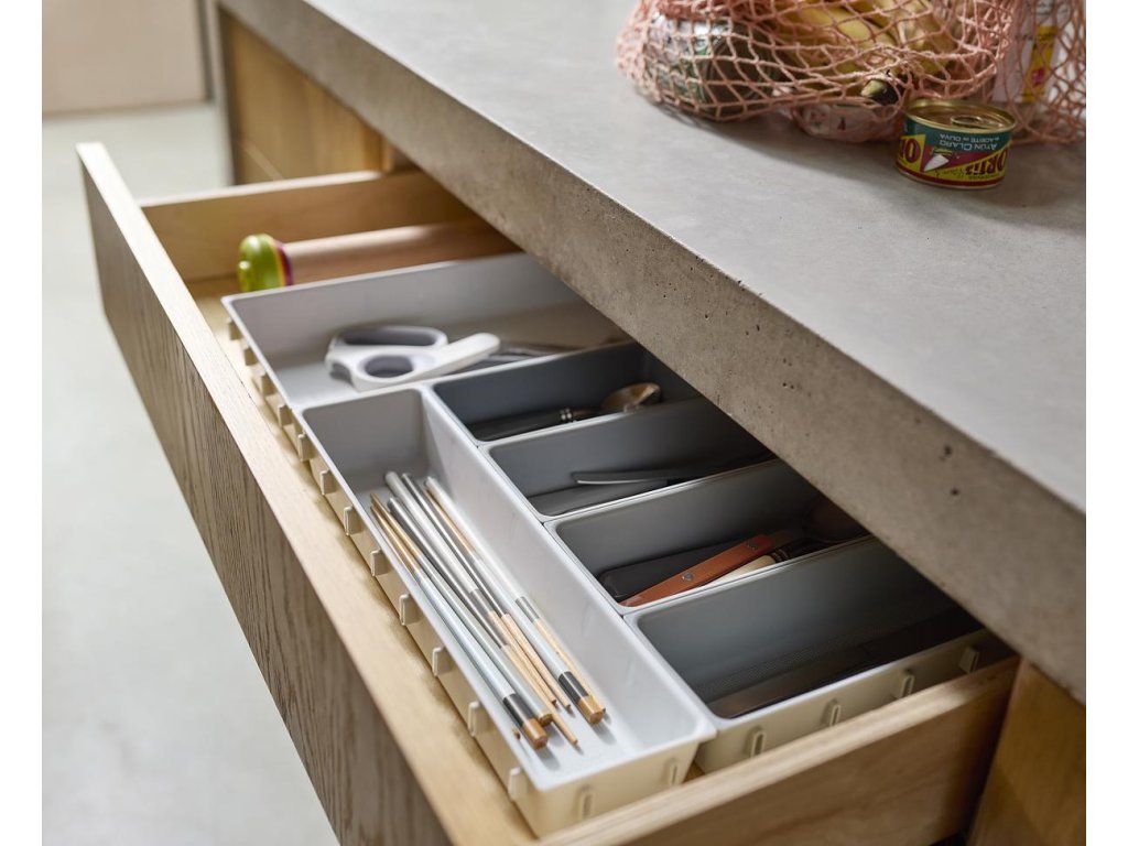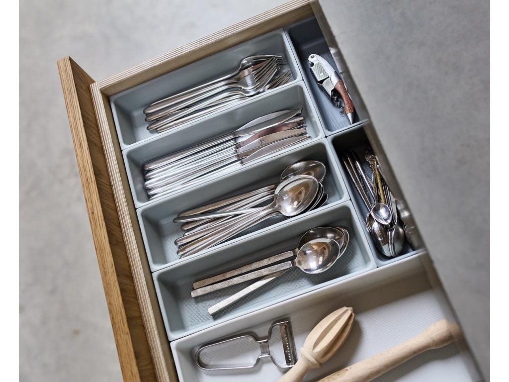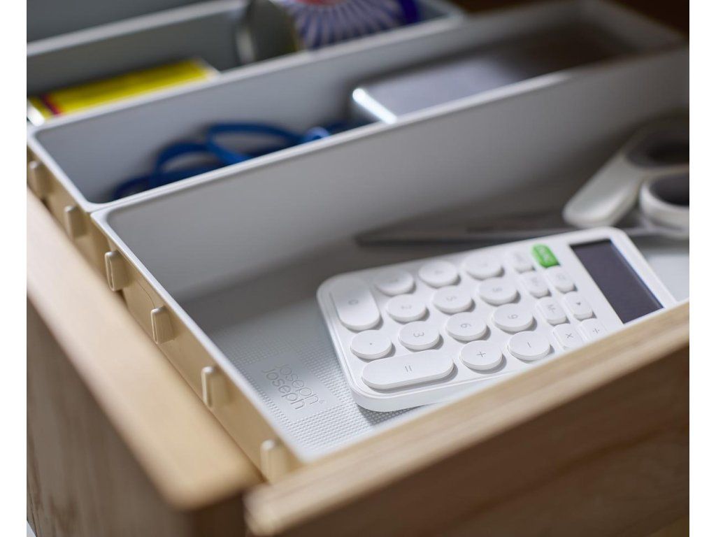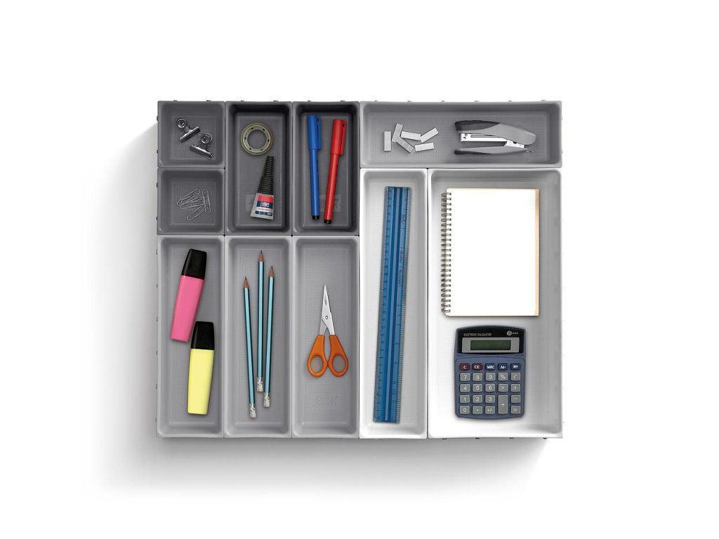 Variabilní zásuvkový organizér JOSEPH JOSEPH Blox 10 8500018 tvoří 10 nezávislých plastových misek různých velikostí, které můžete pomocí klipů umístěných na všech bocích misek libovolně spojovat tak, aby jste optimálně zaplnili prostor zásuvky. Blox využijete pro ukládání příborů, kuchyňských nástrojů, kancelářských potřeb, ale i nástrojů a doplńků pro řemeslníky. Součástí dodávky jsou samolepící protiskluzné nožky.