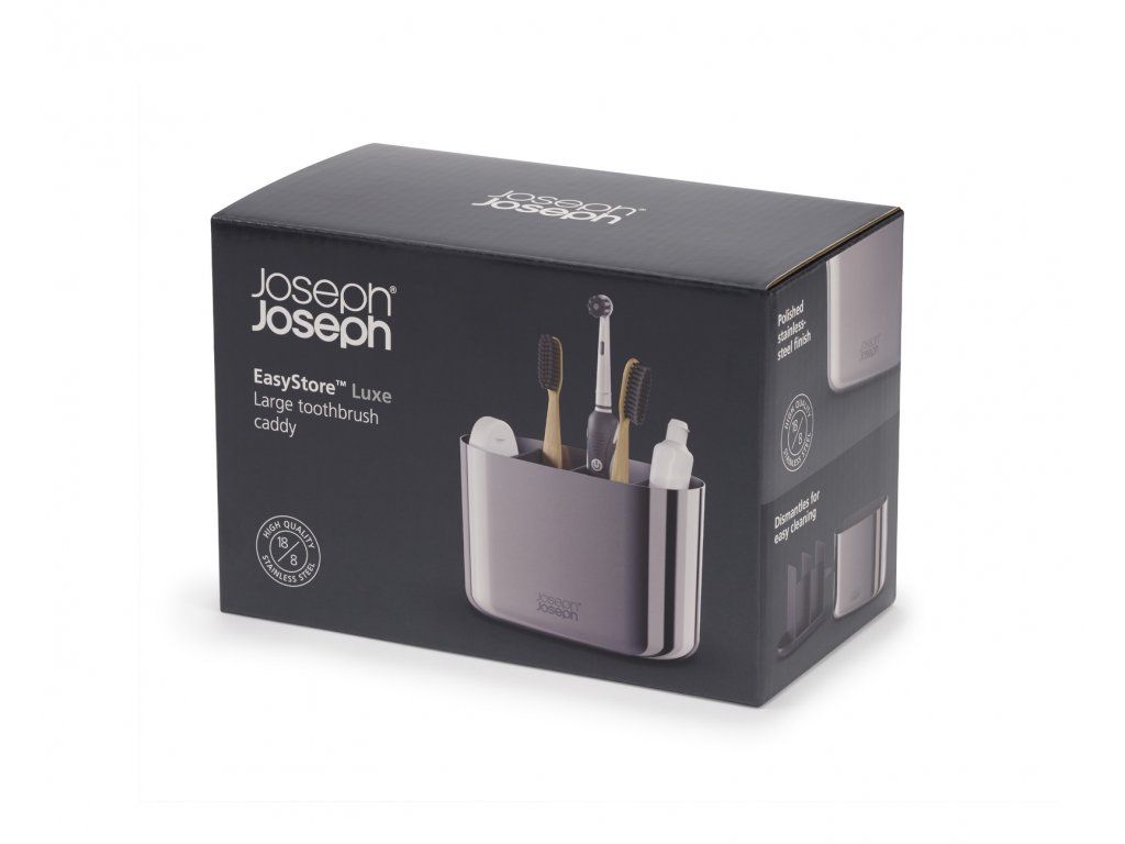 Velký stojánek na kartáčky JOSEPH JOSEPH EasyStore Luxe 70581 z leštěné nerezové oceli. Rozdělený do 4 sekcí poskytujících prostor pro běžné kartáčky, elektrické kartáčky, pastu a zubní nitě. Snadno rozebratelný a čistitelný – odnímatelná plastová vnitřní vložka. Otírejte dočista vlhkým hadříkem a následně osušte měkkým suchým hadříkem. Neužívejte abrazivní čistící prostředky. Velikost: 11,7 x 17,5 x 9,4 cm (VxŠxH).