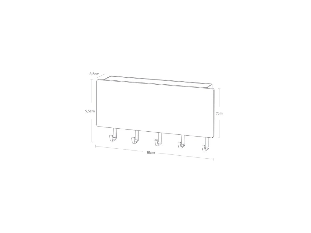 Nástěnný věšáček na klíče s poličkou na dopisy - YAMAZAKI Rin 2729. Korpus z lakovaného kovu, čelní panek z dřevěné dýhy. K upevnění na vruty/hmoždinky nebo plošným magnetem. Dodáváno včetně samostatného samolepícího plošného magnetu umožňujícího dva způsoby instalace - na kovovou plochu (magnet přilepíte na zadní stranu držáku) nebo na hladký nemagnetický povrch (magnet přilepíte na stěnu). Velikost: 9,5 x 18 x 3,5 (VxŠxH).