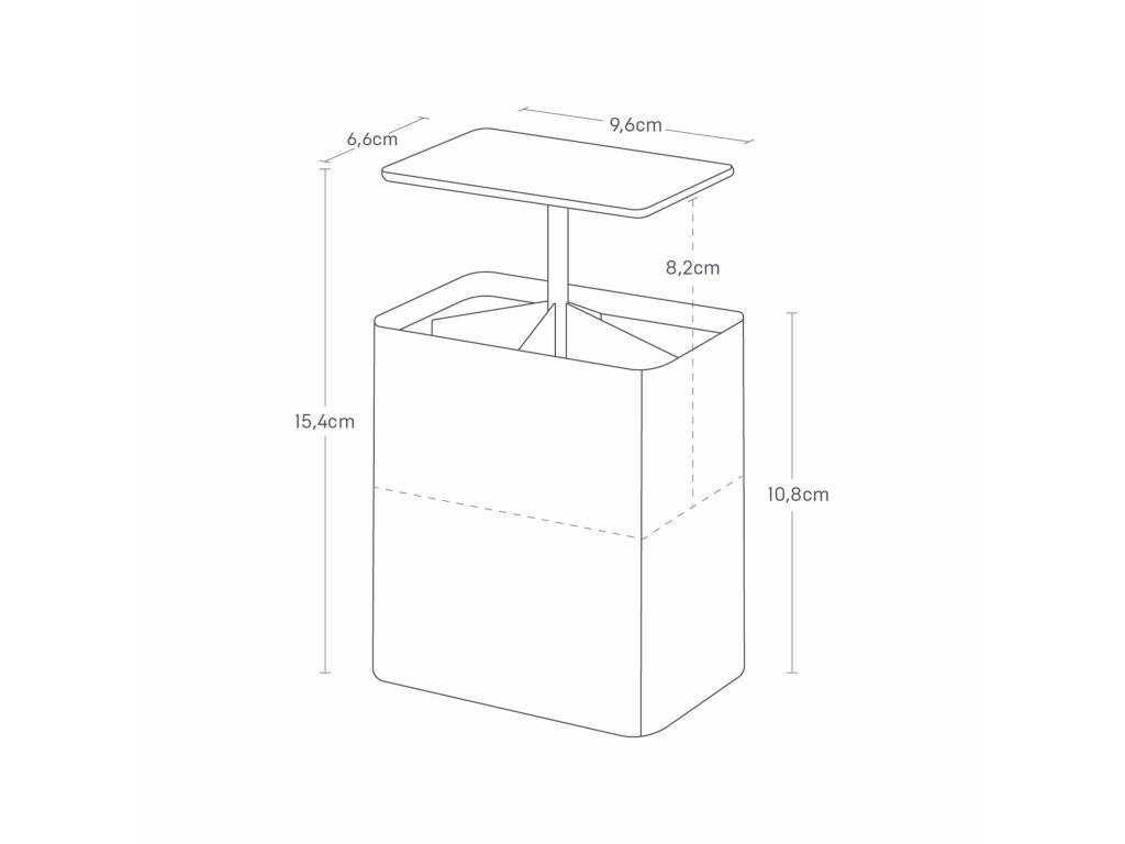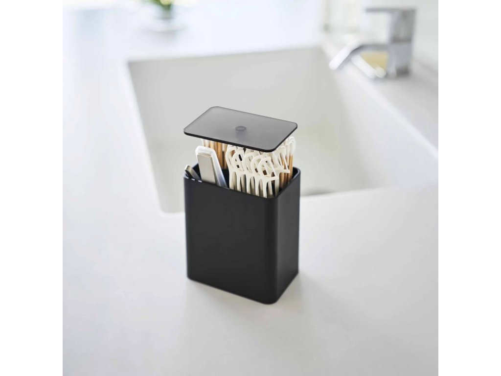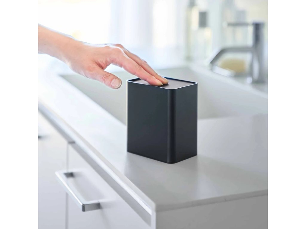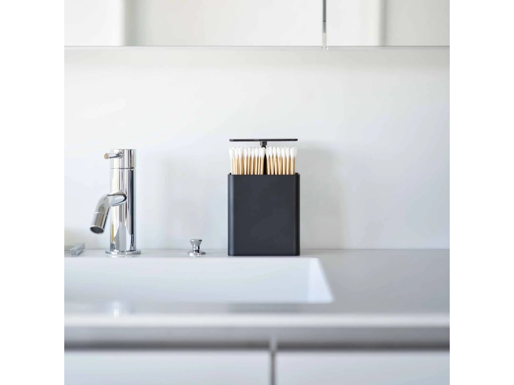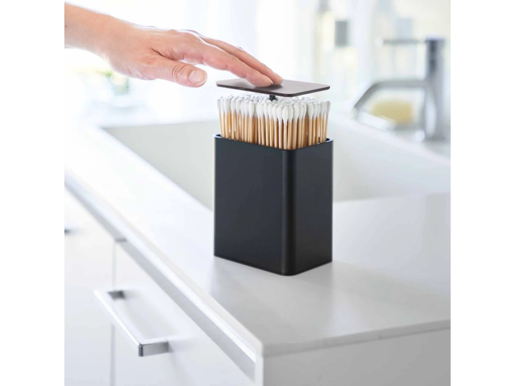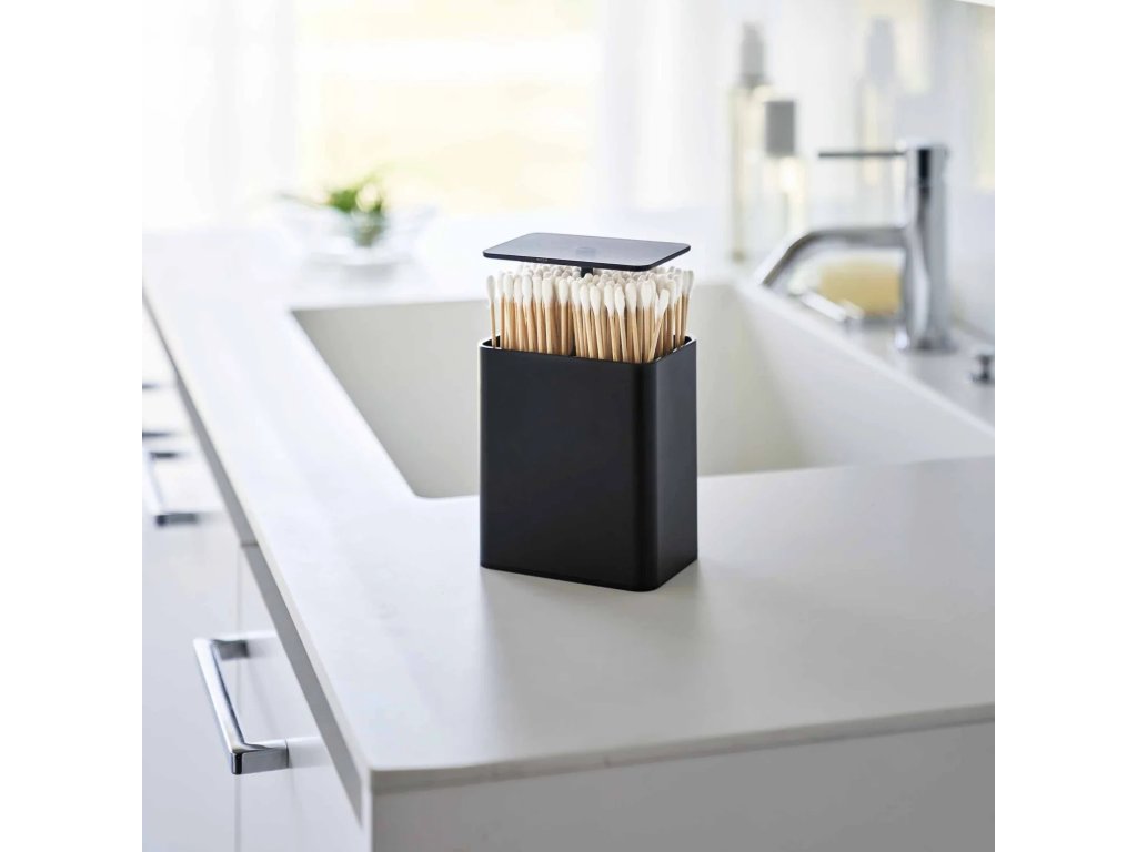 Plastový organizér je praktickým řešením pro uložení malých koupelnových nezbytností, jako jsou vatové tyčinky nebo pinzety. Má čtyři přihrádky, poloprůhledné víčko a mechanismus otevírání jednoduchým stiskem na horní plochu. V případě užití jako zásobník vatových tyčinek je kapacita 200 ks. Dodáván v bílé (10284) a černé barvě (10285).