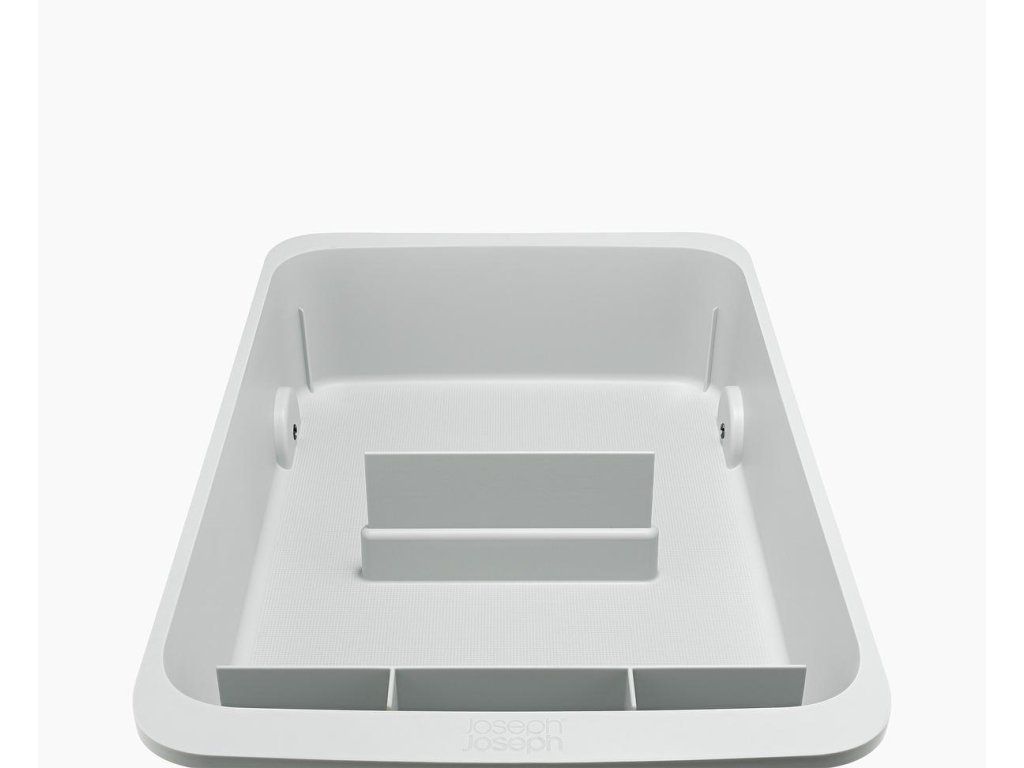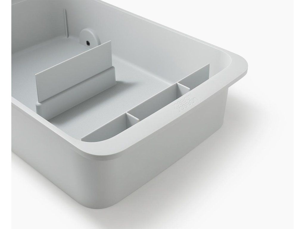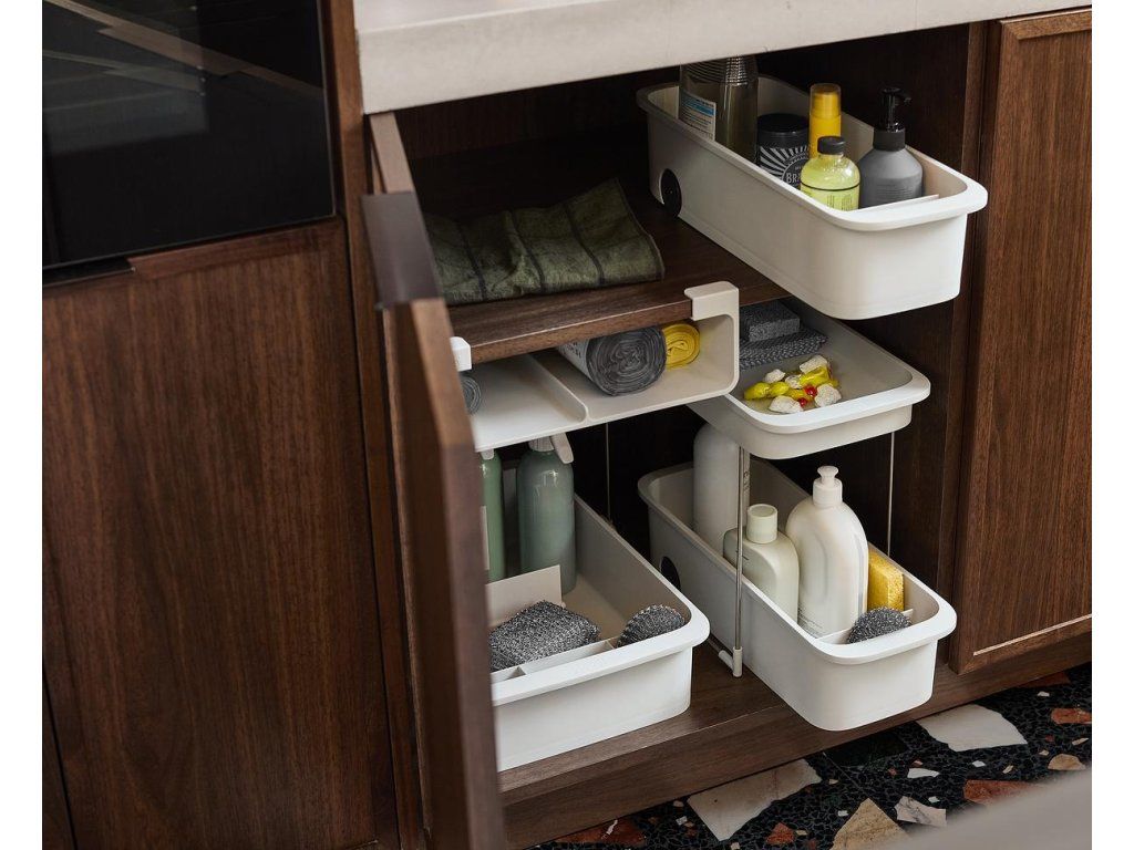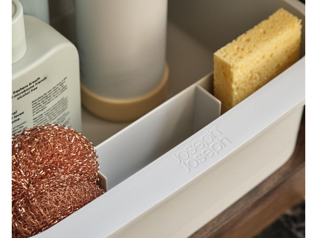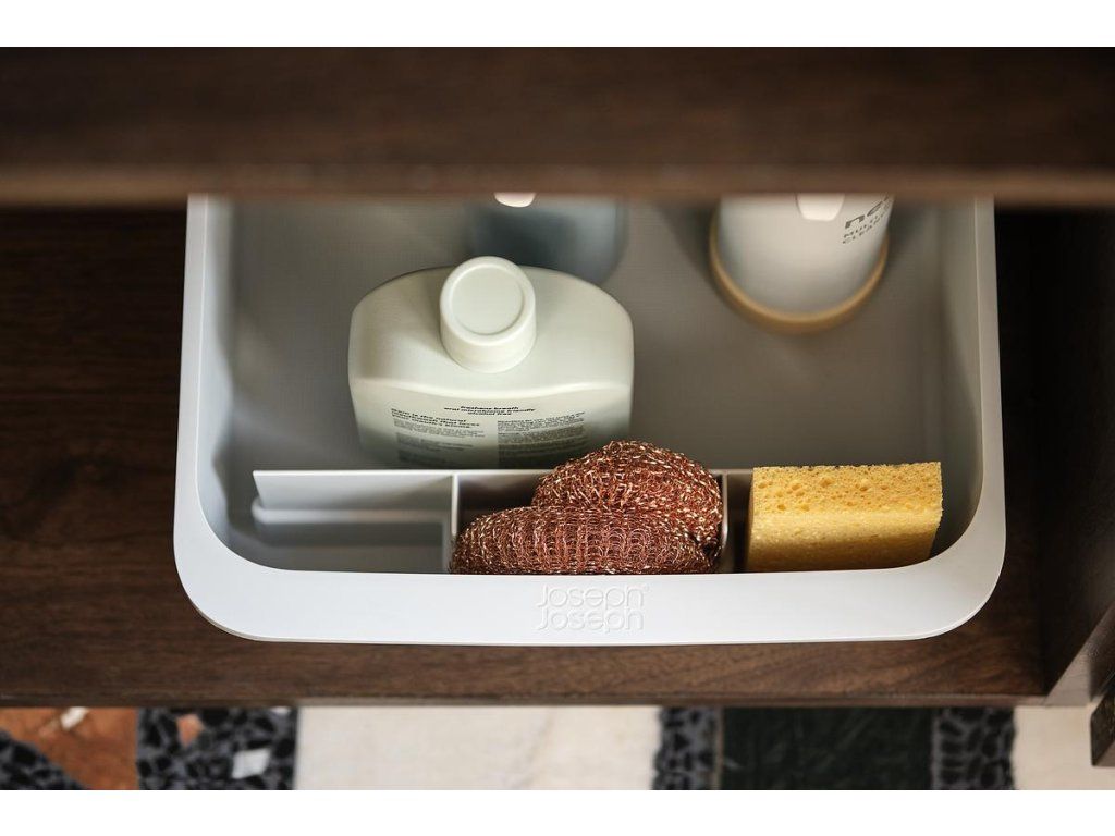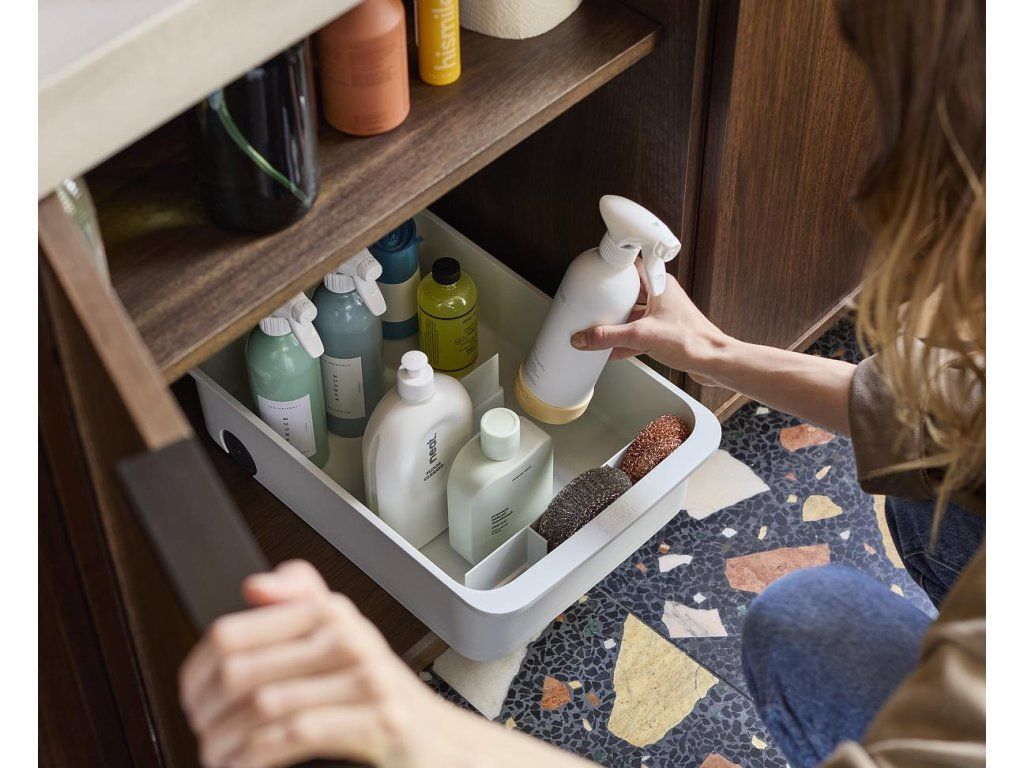 Kuchyňský zásobník na čistící prostředky JOSEPH JOSEPH CupboardStore 8500002. Ideální pro ukládání velkých lahví a balíčků s čisticími prostředky. Přepážka udržuje věci úhledně uspořádané. Přední přihrádka na houbičky a hadříky. Zadní kolečka pro snadné vyjmutí ze skříňky.