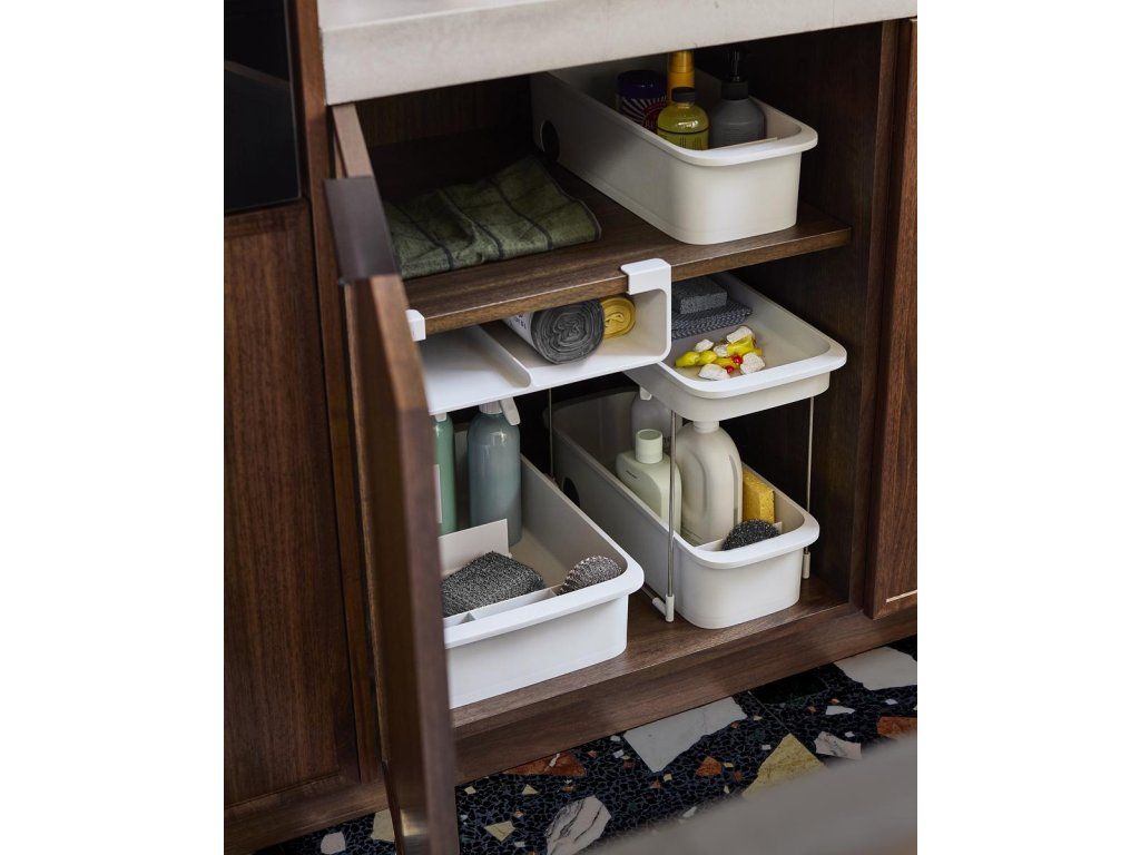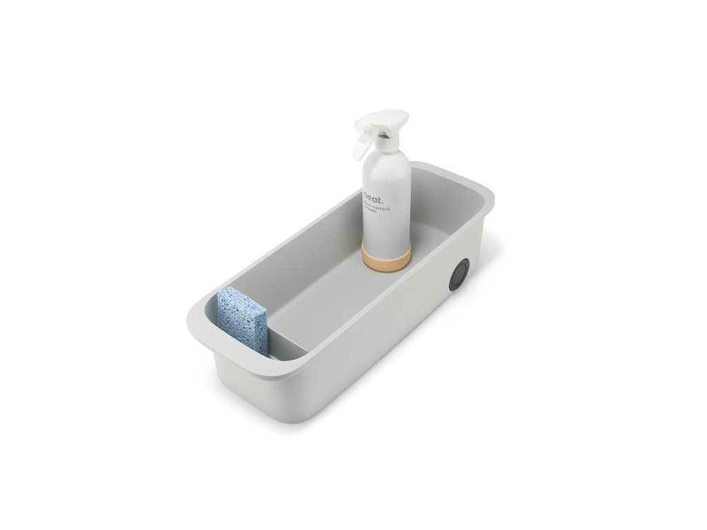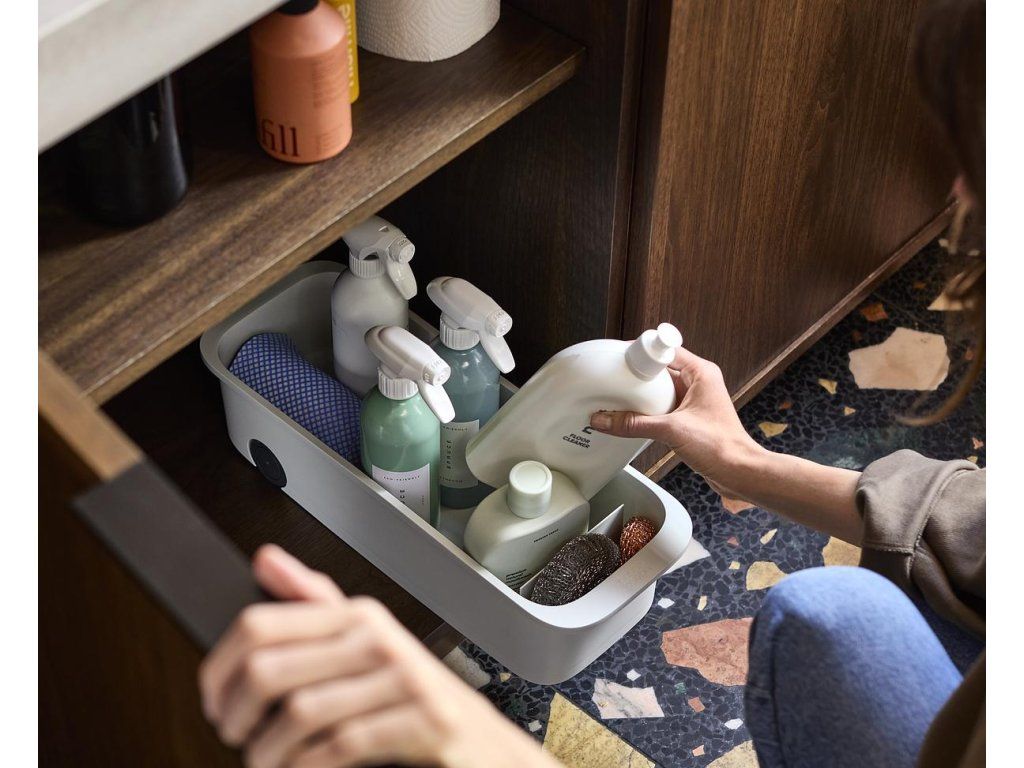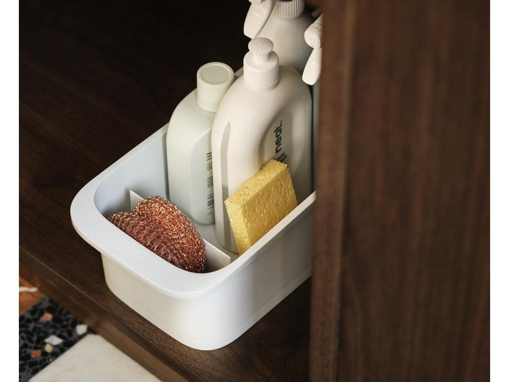 Objemný kuchyňský zásobník na čistící prostředky, houbičky a kartáče JOSEPH JOSEPH CupboardStore 8500022. Velký prostor pro láhve a spreje, menší přihrádka na houbičky a kartáče. Zadní kolečka pro snadné vyjmutí ze skříňky.