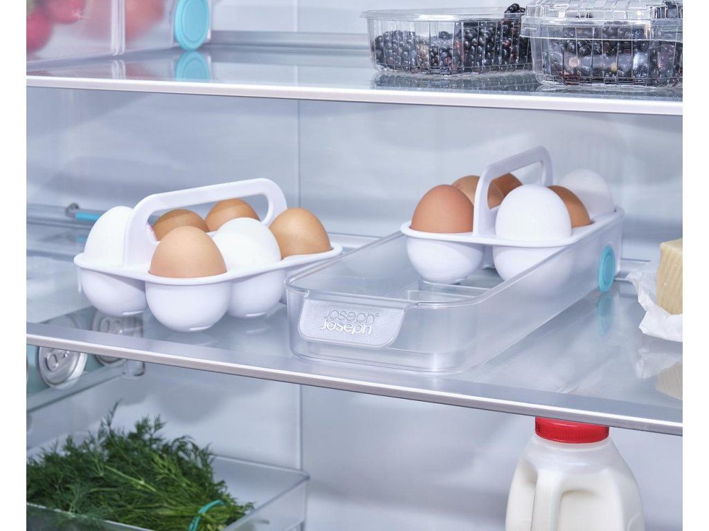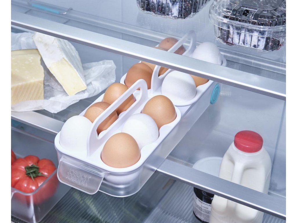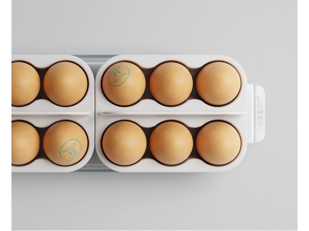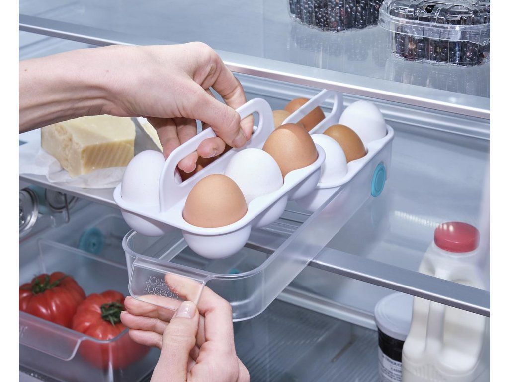 Zásobník na vejce do lednice JOSEPH JOSEPH FridgeStore 8500010. Přehledný zásobník tvoří spodní základna s rukojetí a kolečky pro snadné vyjmutí a dva odnímatelné tácky po 6 vejcích.
