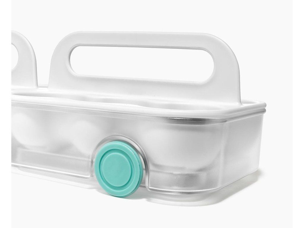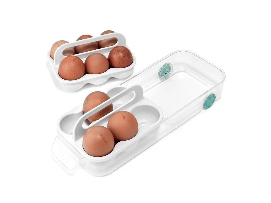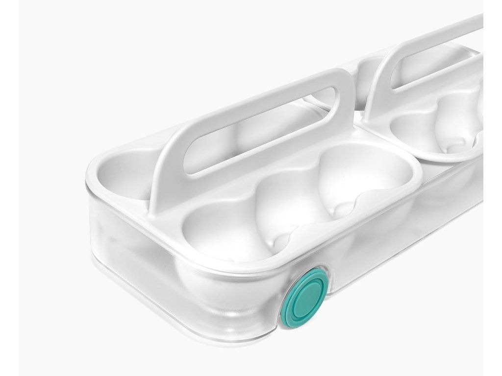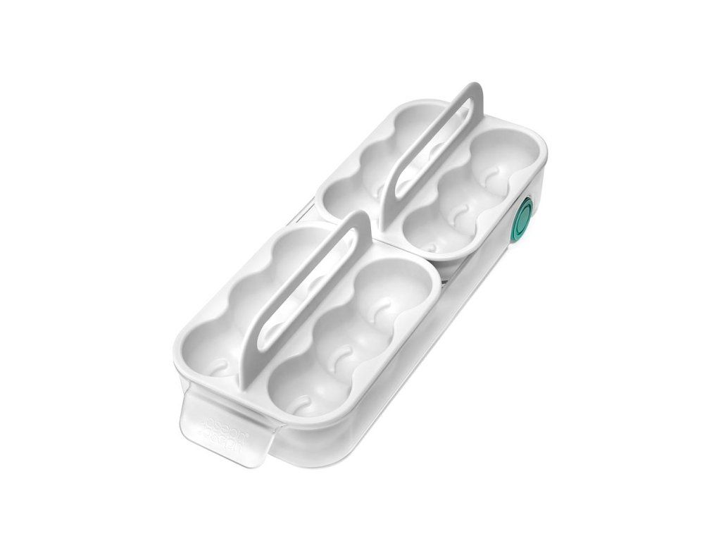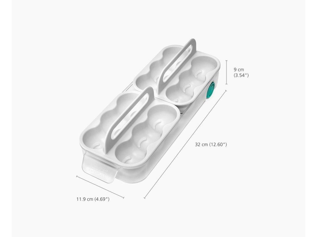 Zásobník na vejce do lednice JOSEPH JOSEPH FridgeStore 8500010. Přehledný zásobník tvoří spodní základna s rukojetí a kolečky pro snadné vyjmutí a dva odnímatelné tácky po 6 vejcích.
