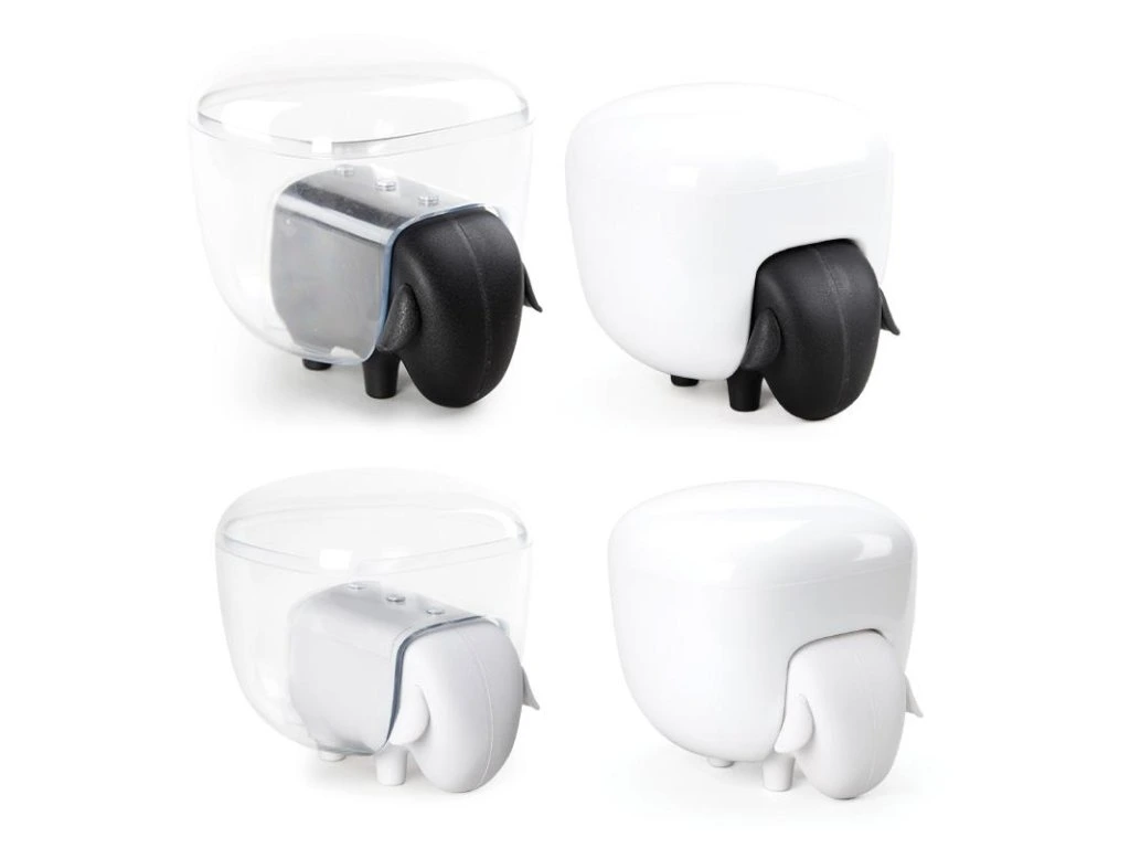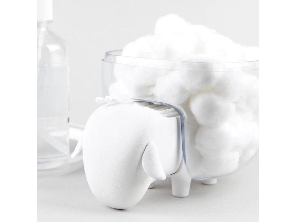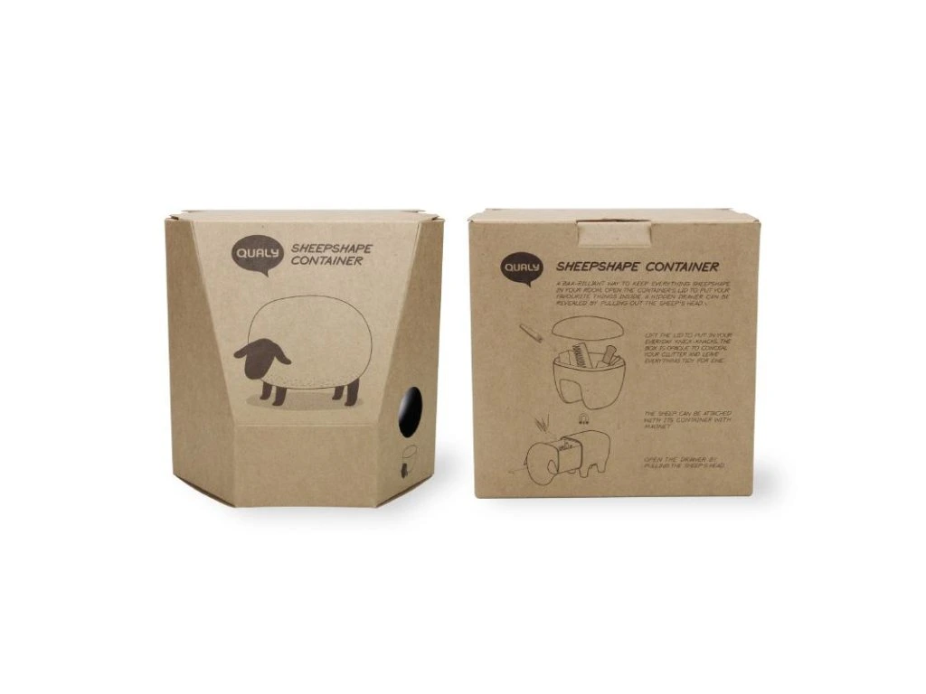 QUALY Sheepshape Container - ovečka se zásuvkou a velkou dózou. Zatažením za hlavu ovečky se otevírá zásuvka, do které se ideálně vejdou vatové tyčinky. Na zádech ovečky je odnímatelná dóza s víčkem. Dózu na ovečce přidržují tři malé magnety. Při užití v koupelně můžete prostornou dózu zaplnit vatovými tampóny, menšími hřebeny, sponkami a jinými drobnostmi. Hodí i do dětského pokoje na menší hračky, do hotelové recepce na bonbóny, jako organizér na pracovní stůl nebo jako dóza na šperky.