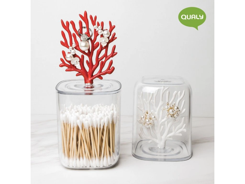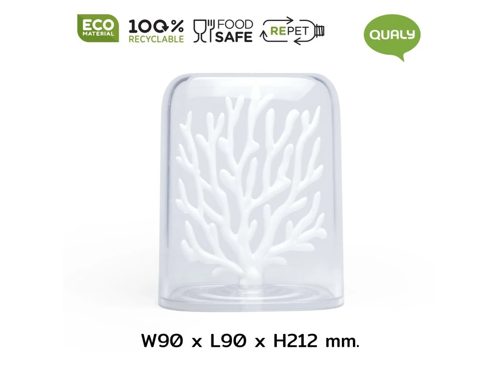 Plastová transparentní dóza s víčkem Coral Container od thajské výrobce vtipných designový dárků QUALY DESIGN. Víčko je zakončeno větvičkou napodobující mořský korál. Použijete-li větvičku korálu jako stojánek na šperky, můžejet ji přiklopit obrácenou dózou. Velikost: 21 x 9 x 9 cm (VxŠxH).