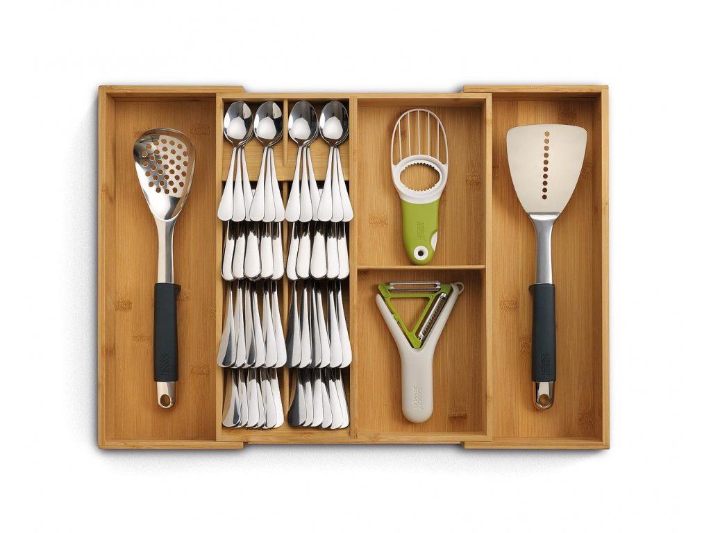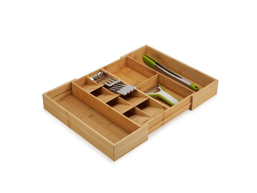 Bambusový roztažitelný zásuvkový organizér JOSEPH JOSEPH DrawerStore Bamboo Expanding 851696. Ukládání příborů pod úhlem nad sebou ušetří více než polovinu místa v zásuvce. Příbory můžete vkládat do označených slotů oboustranně. Další přihrádky jsou určeny k uskladnění velkých i malých kuchyňských nástrojů. Organizér lze použít v zásuvce s minimální hloubkou 8 cm. Čistěte navlhčeným hadříkem. Povrch organizéru olejujte proti vysychání. Velikost: 6,8 x 32-56 x 40 cm (VxŠxH).